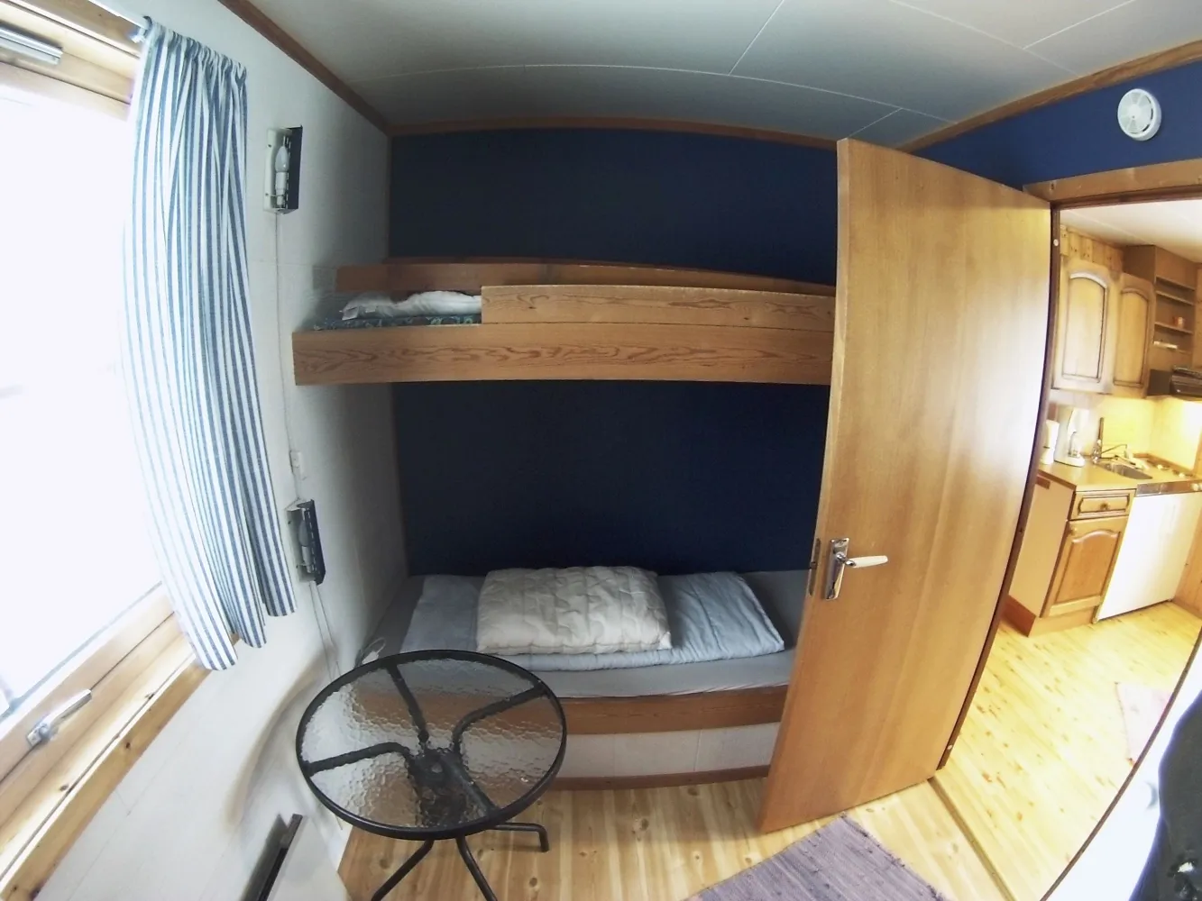 This cabin has 2 bedrooms, with 1 bed(120cm) and 1 bed( 75cm )in each bedroom, a livingroom, bath with shower, and kitchen. It also has a washing machine and dishwasher. 2 extra beds for children/small adults, in the entre, length 175cm.